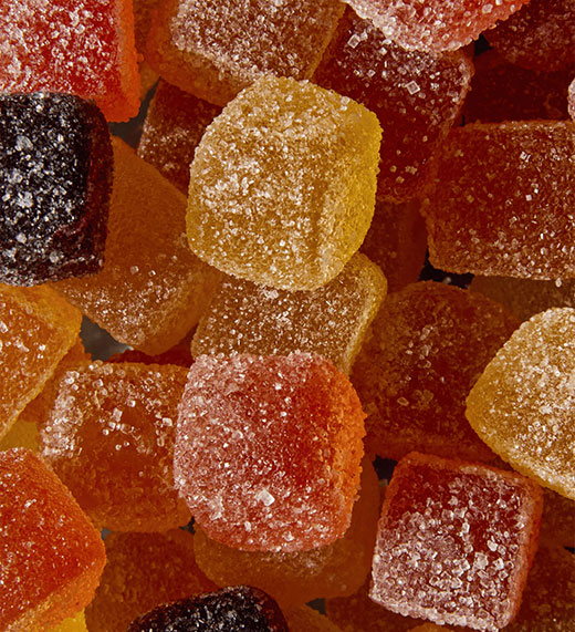 zucchero, sciroppo di glucosio, frutta in proporzione variabile 20% (polpa di mela, pera, pesca, albicocca, fragola, mirtillo, lampone, succo di arancia, limone e mandarino), essenze di arancia, limone e mandarino, aromi naturali.