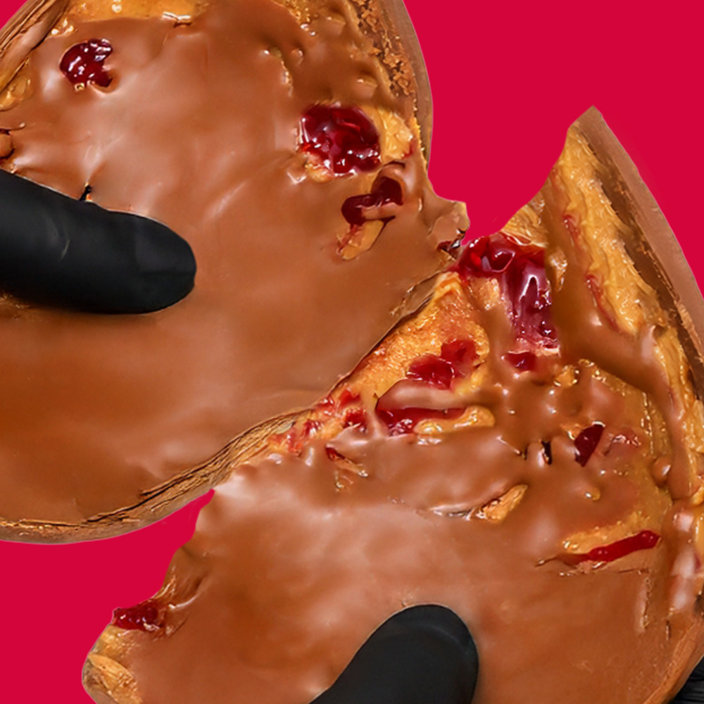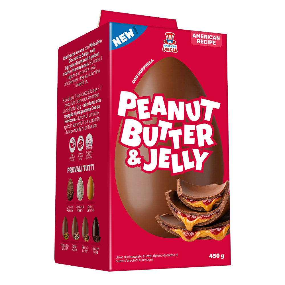 Ingredienti: cioccolato al latte 75% (zucchero, burro di cacao, LATTE intero in polvere, pasta di cacao, emulsionante: lecitina di SOIA E322; aroma naturale di vaniglia); burro d’ARACHIDI crunchy 18% (ARACHIDI tostate 90%, olio di palma, emulsionanti: mono e digliceridi degli acidi grassi E471; sale); lamponi 7% (lamponi 45%, zucchero, sciroppo di glucosio-fruttosio, gelificante: pectina E440i; correttore di acidità: acido citrico E330, difosfato tetrasodico E450iii; conservante: acido sorbico E200; aromi.